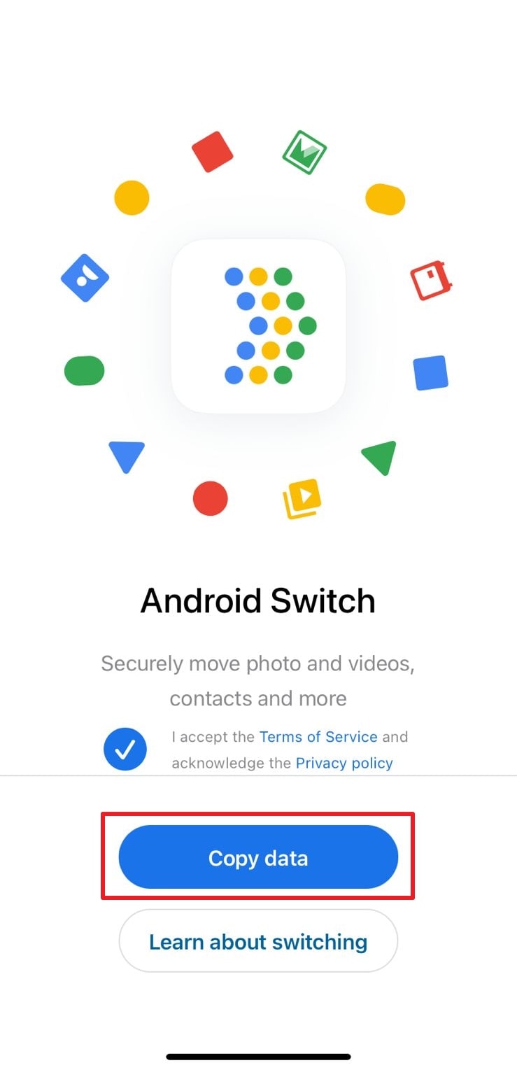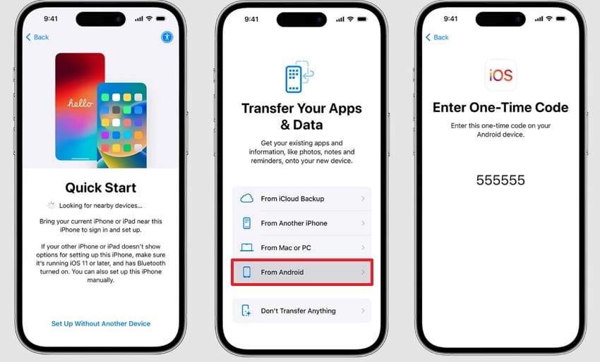 While setting up a new phone, choose “From Android.” Copy the code and enter it on the old phone.