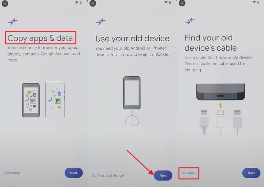 Utilize the “Get Started” button on the new phone. Press “Next” on the following two screens and choose the “No Cable” option.