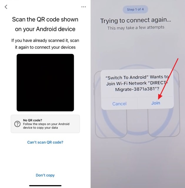 Tap “Continue” to receive a QR code. Scan it with the old phone and hit “Join” to continue.