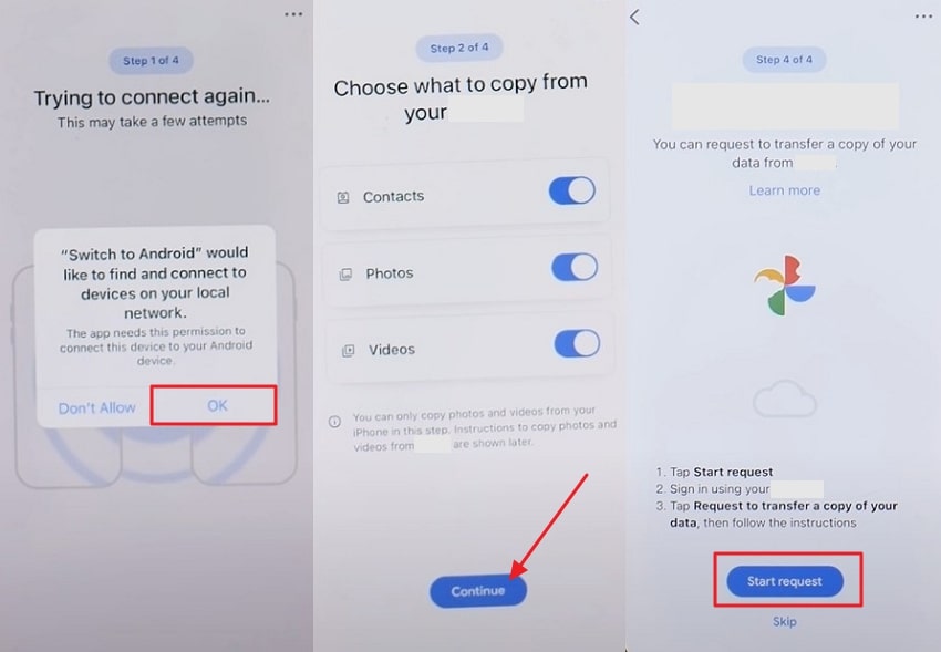 Tap “OK” for network access. Toggle “Messages” and hit the “Continue” button. Press the “Start Request” button.