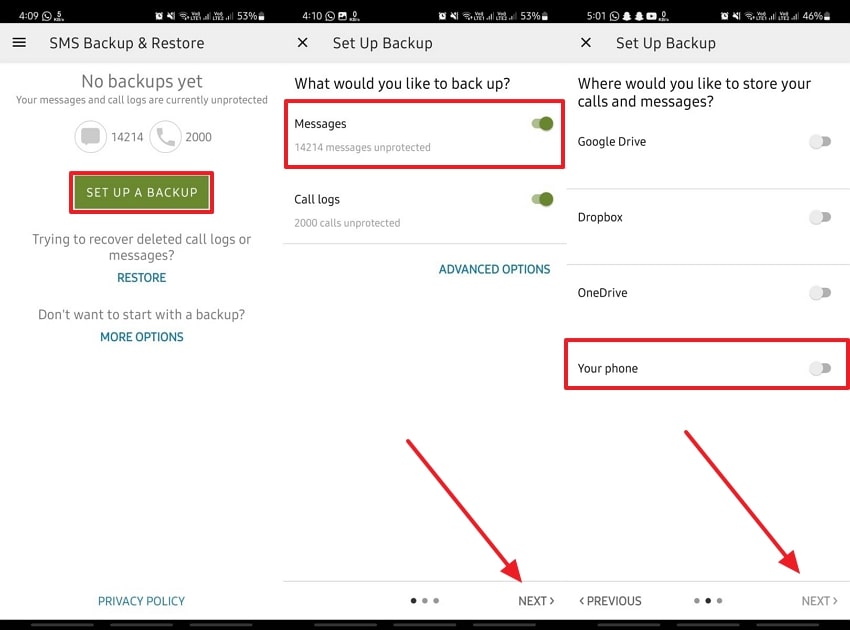 The SMS Backup & Restore application allows users to create a full backup of their messages and call data. It lets people store backed-up data in a local folder or on cloud storage, such as Google Drive and Dropbox. Furthermore, the tool supports manual and scheduled backups on a daily and weekly basis. These are the steps to import Google messages to a new phone with this app: