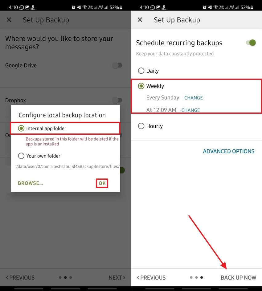 Select "Internal App Folder" and press "OK." Pick the "Weekly" and "Back Up Now" options.
