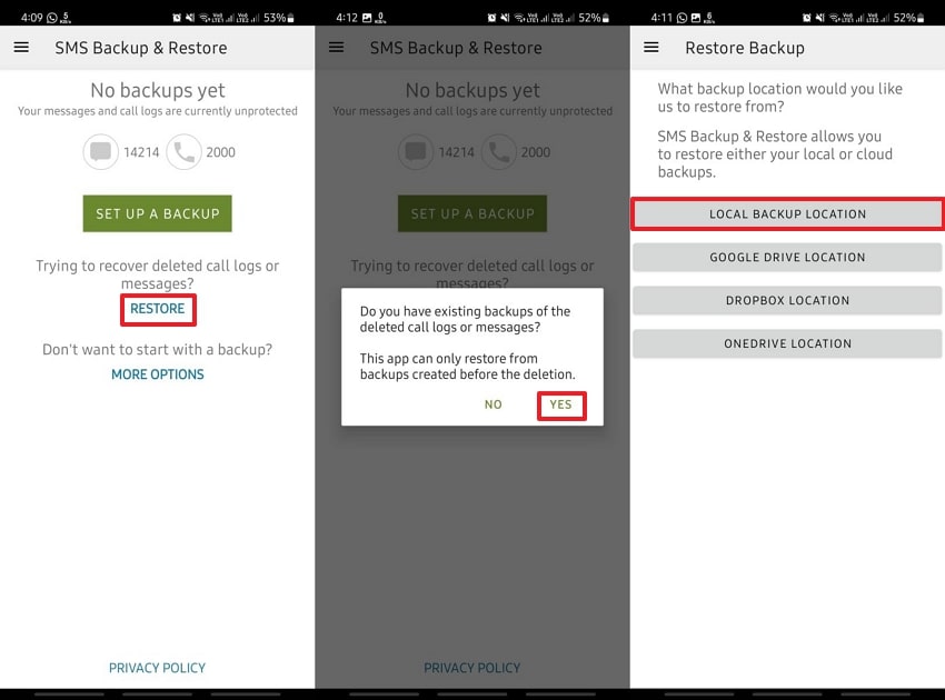 Install the app on the new phone and tap the “Restore” button. Tap “Yes” and choose “Local Backup Location.”