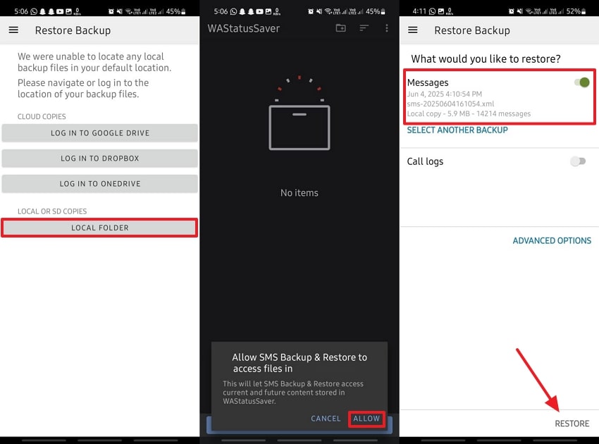 Choose “Local Folder.” Enter the folder where you transferred the backup file and press “Use This Folder” > “Allow.” Select “Messages” and hit the “Restore” button.