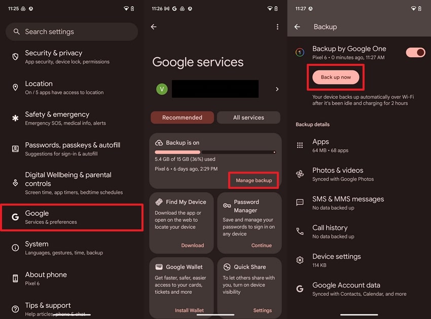 Access “Google” in settings and hit the “Manage Backup” button. Tap the “Backup Now” button.