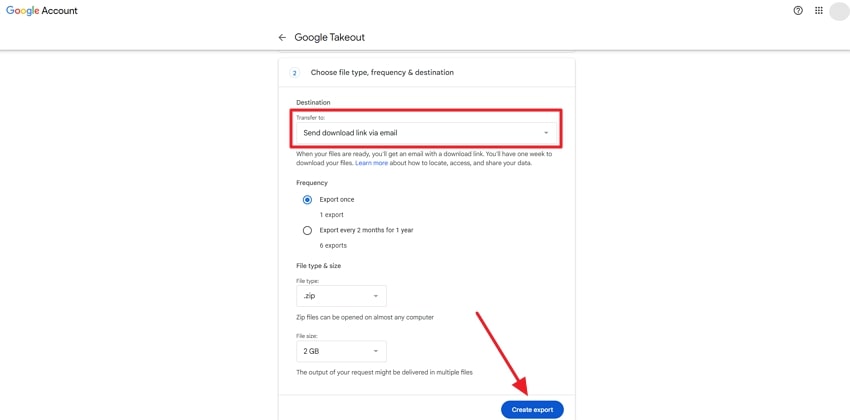 Step 2: Access the "Transfer To" menu, select the "Send Download Link Via Email" option, and press the "Create Export" button.