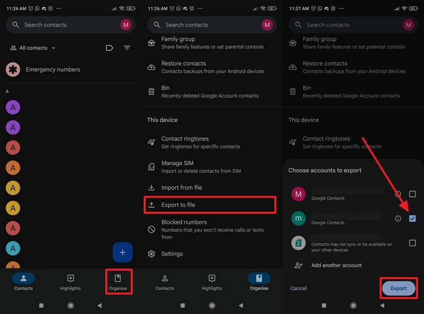 Instructions: Access the "Contact" app and press the "Organize" option. Tap the "Export to File," choose another email or add one, and press the "Export" button.
