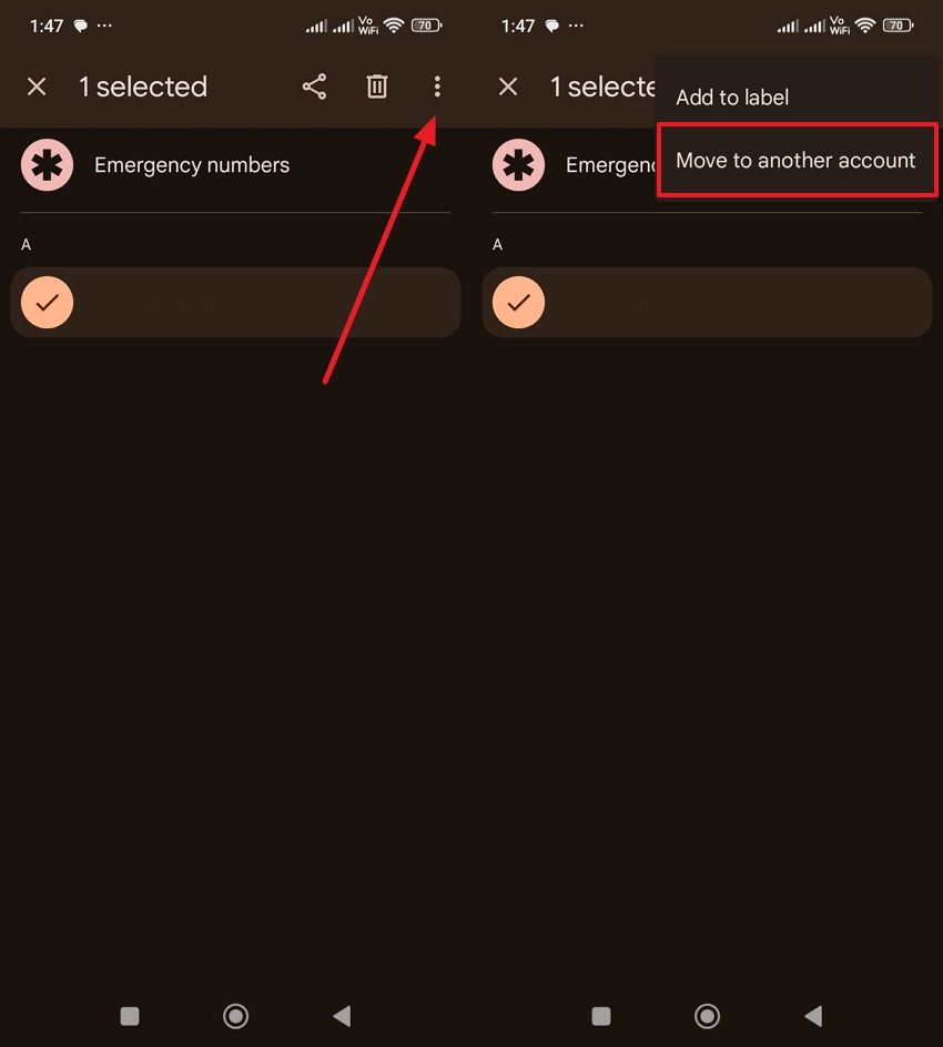 Instructions: Open the old Gmail account > Three Lines>Contacts and select the contact to move. Tap the Three-Dots>Move to another account option and confirm the target account to move contacts.