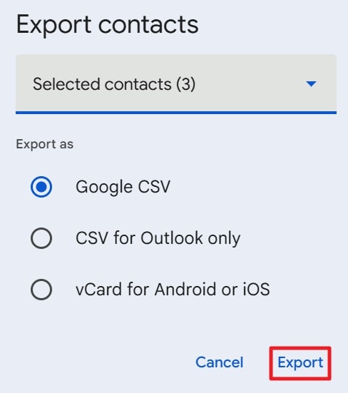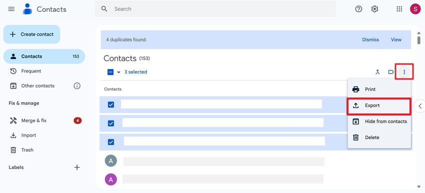 Step 2: Select contacts > Three Dots > Export option from drop-down.