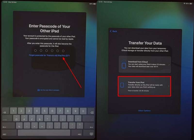Enter the old iPhone's password when prompted on the iPad and proceed. After covering all necessary initializations and security details, select the "Transfer from iPad" option to begin the transfer.