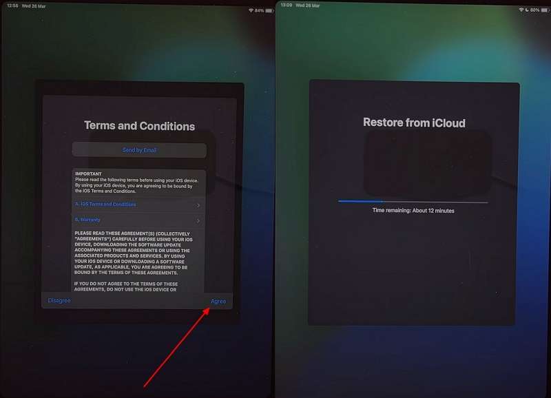 Press the "Agree" button to accept the terms and select the "Choose an iCloud Backup" option.