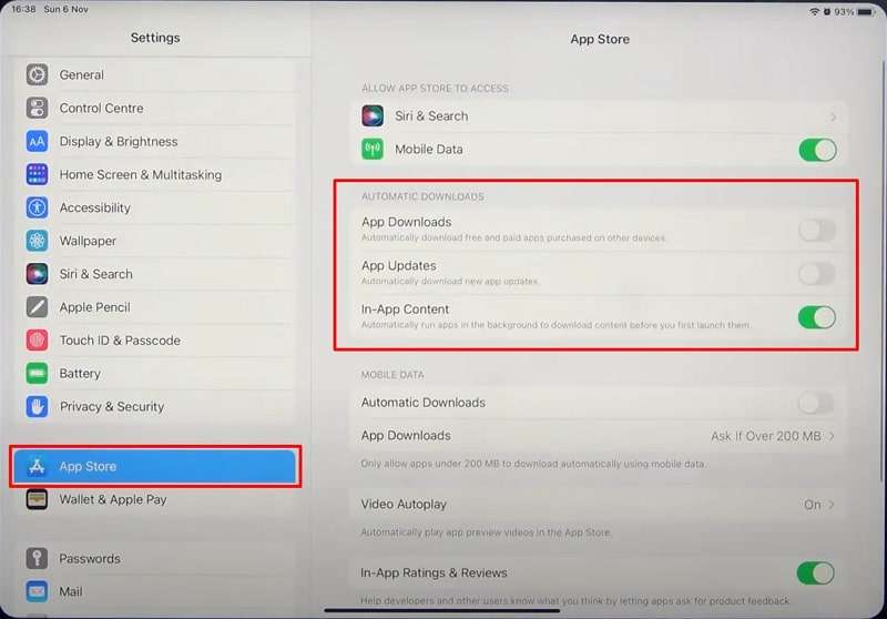 Instructions: Head to "Settings," tap the "App Store," and toggle the "App Downloads" and "App Updates" option in the "Automatic Downloads" section.