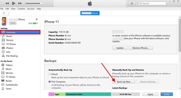 - Store Data: You have to create a full backup using iTunes/Finder or even MobileTrans to protect it. This way, when anything goes wrong while you transfer data from iPhone to iPhone, you can restore it.