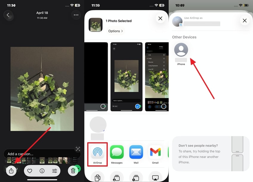 Step 1. Choose an image or other data, and tap "Share > AirDrop." Opt for the device that appears nearby.