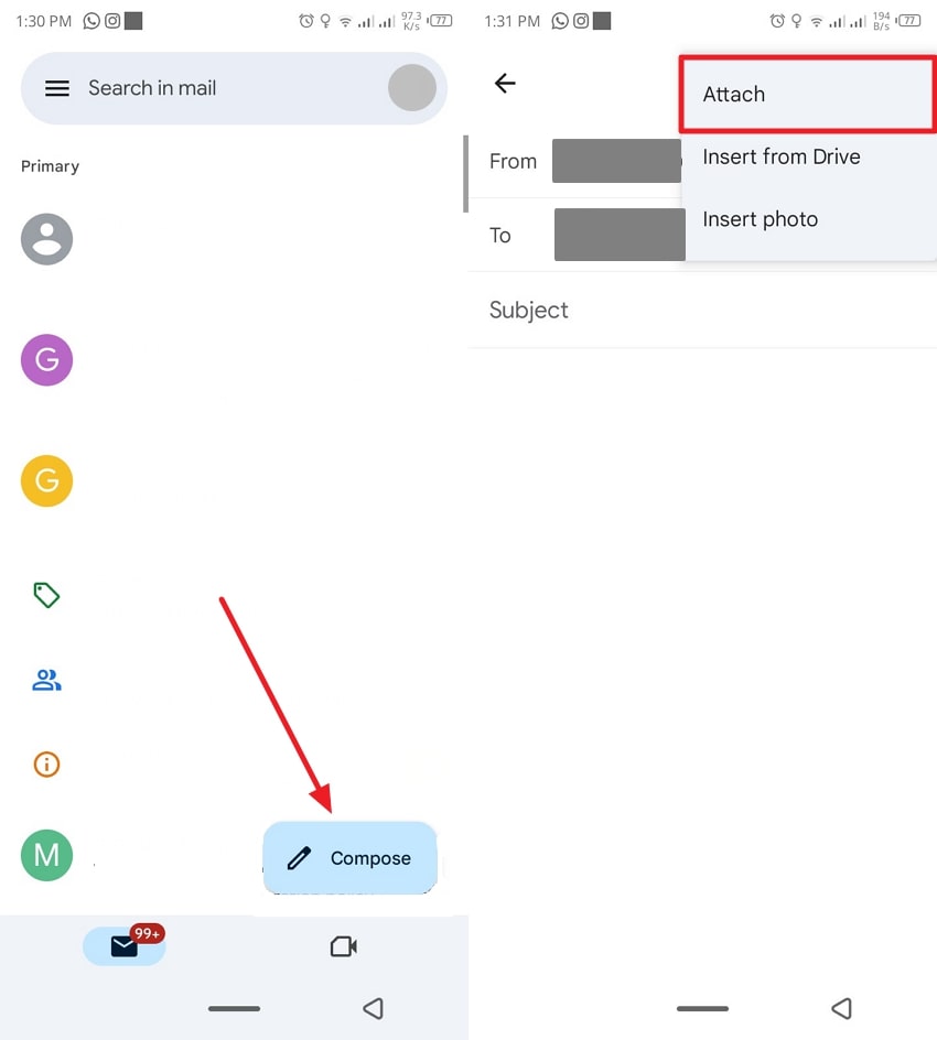 If cloud services don’t suit you, email is another simple option to share videos across devices. You can use Gmail to send videos from Android to iPhone without installing any extra apps. Just attach the video to your Gmail and send it to your iPhone’s email address. Thus, let’s dive below to learn how to send a long video from Android to iPhone easily: