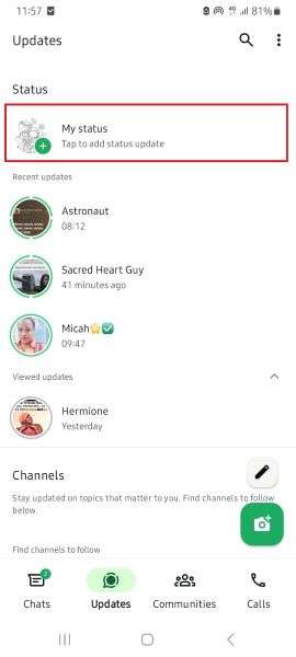 - Open WhatsApp on your phone and tap the Updates icon at the bottom of your screen.