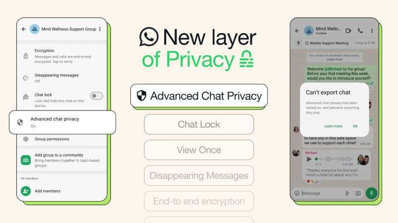 WhatsApp's new privacy feature is the Advanced Chat Privacy. This feature protects your chats and shared media by preventing anyone from exporting them outside the chat. WhatsApp announced that this is the first version of this feature, with more updates to come soon.