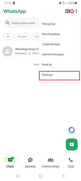 - Open WhatsApp on your Android phone, tap the Ellipsis icon (three-dot symbol) at the top-right corner, and select Settings.