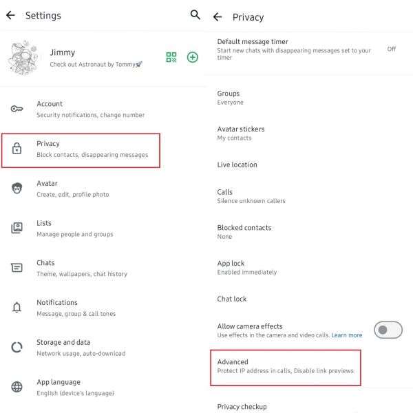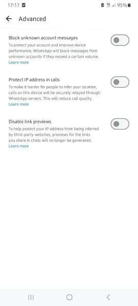 - Here, you can block unknown account messages, protect your IP address in calls, and turn off link previews.