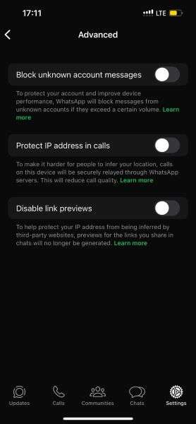 - You can use the toggle switches to choose whether to block messages from unknown accounts, protect your IP address in calls, or disable link previews in chats.