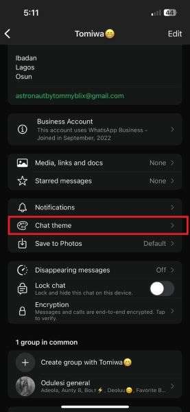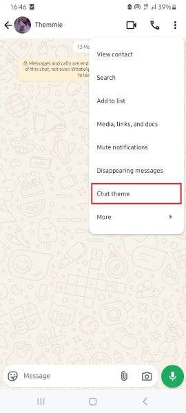 - Tap on the Chat or Contact Name at the top of the screen and select Chat Theme.