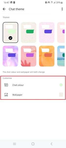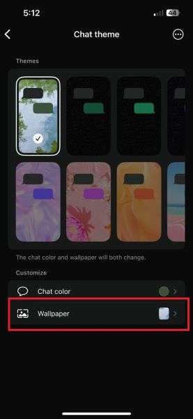 - You will see different pre-set chat themes on the next page. Scroll down to the Customize tab and tap on Wallpaper.