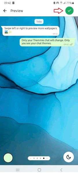 - Scroll through the different wallpapers to find the one you want. Then, preview it and tap on the Green checkmark icon at the top of the screen to change the chat wallpaper.