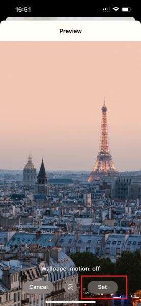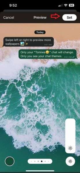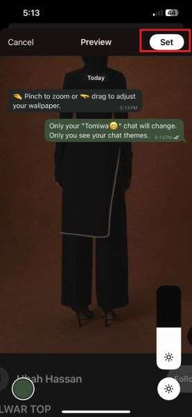 - Select the custom image you want to use as the new chat wallpaper and tap Set at the top of the screen.