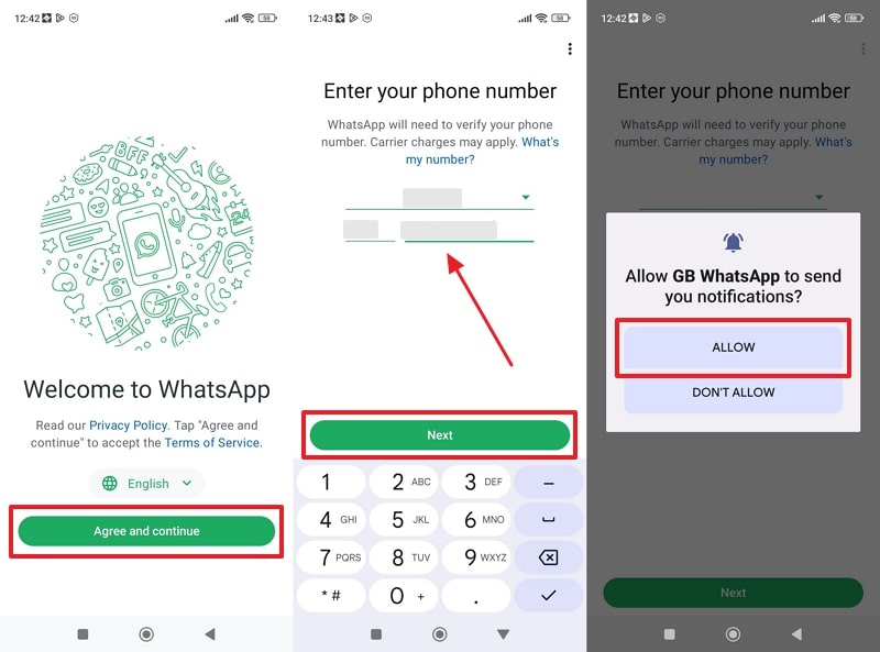 Step 3. Subsequently, launch the app when it is installed and press the "Agree and Continue" button from the main display. Afterward, enter your "Country" name followed by your number in the designated area and press the "Next" button. Next, select the "Allow" option to enable the app to send you notifications for verification.