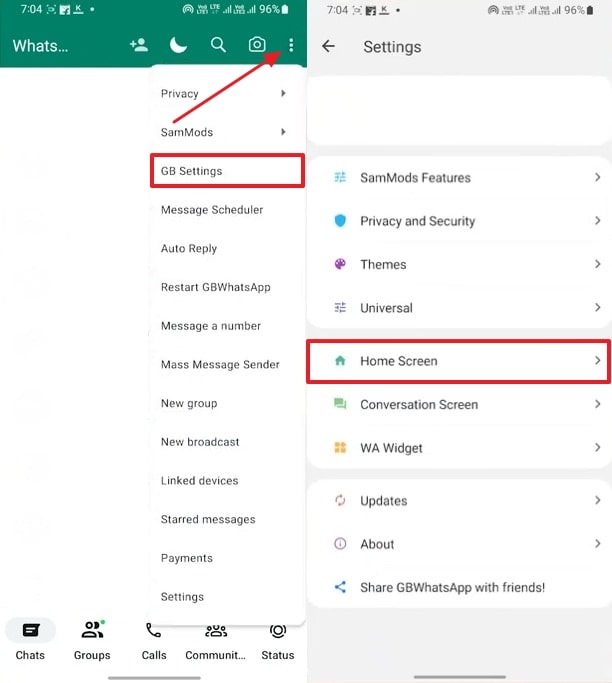 Step 4. Once you reach the main chatting screen, tap the “Three Dots” icon and select the “GB Settings” option from the drop-down. Following that, select the "Home Screen" option to access additional settings on your screen.