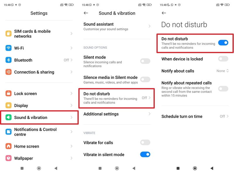 For Android: Commence by heading to your device's settings and selecting the “Sound & Vibration” option. Afterward, scroll down to opt for the “Do Not Disturb” features and enable its toggle on the next screen.