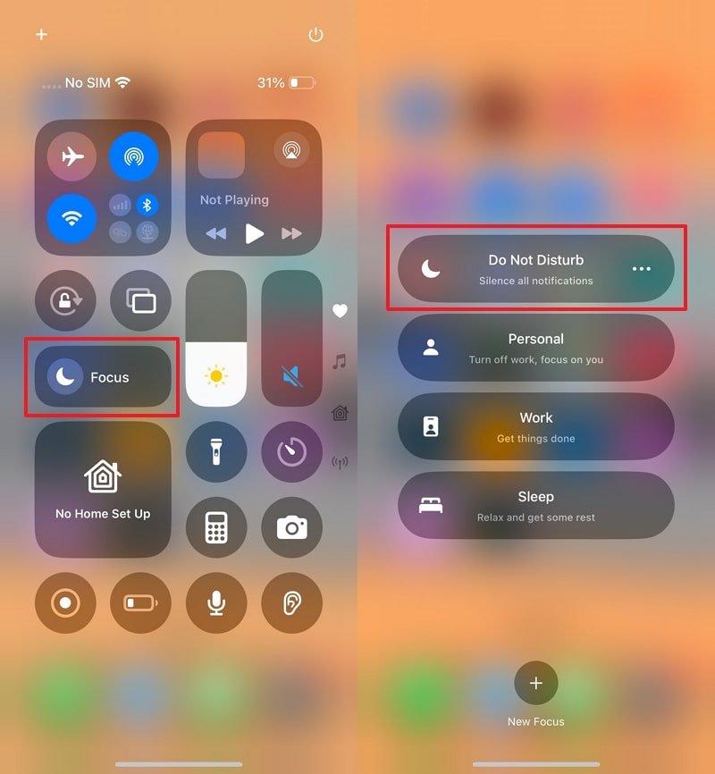 For iPhone: Initially, access the "Control Center" by swiping down from the top right corner of your screen and tapping the "Focus" mode. Next, press the "Do Not Disturb" feature to enable it and finish the task.
