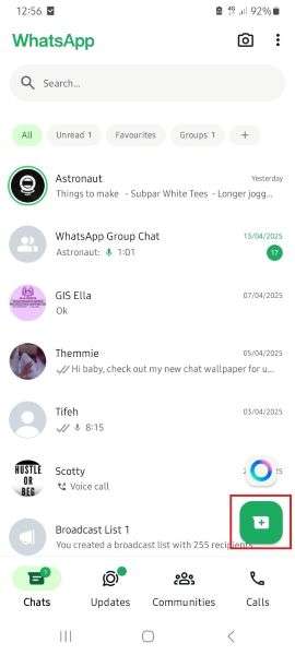 - Open WhatsApp on your Android phone and tap the New Chat icon (the green plus symbol) at the bottom right of your screen.