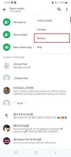 - On the next page, you'll see all your WhatsApp contacts. Tap on the Ellipsis icon (the three-dot menu) at the top right of your screen. Then select Refresh.
