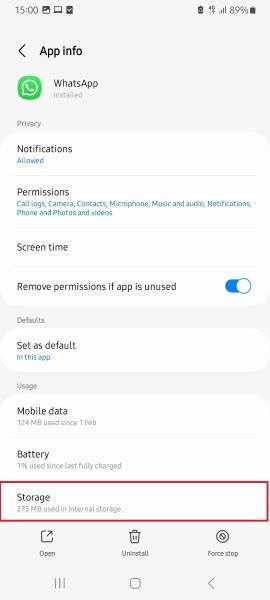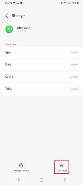 Here is how I cleared WhatsApp's cache data on my Samsung phone: