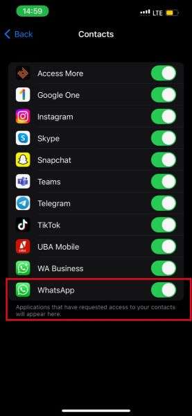 - Tap on the toggle switch next to WhatsApp a few times to refresh your contacts and ensure the icon is green.