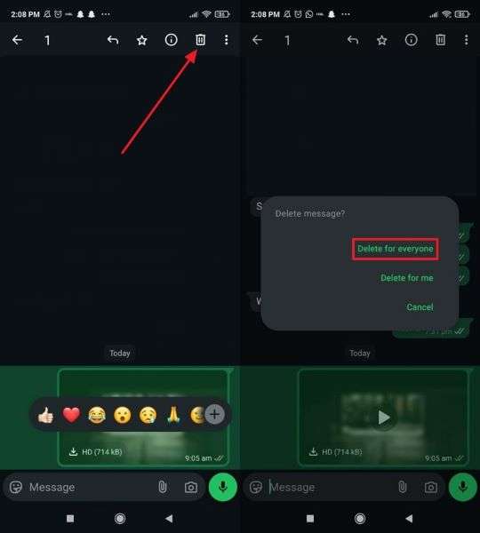 Instructions: To do so, first access WhatsApp on your Android phone and open chat for the particular contact to recall the message. After this, long-press the message you want to remove and navigate to the "Dust Bin" icon at the top. From the pop-up, choose the "Delete for Everyone" option to remove that text from the chat.