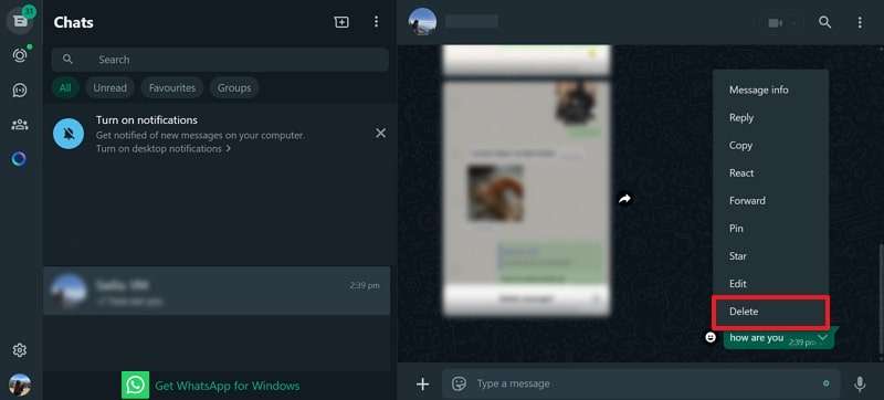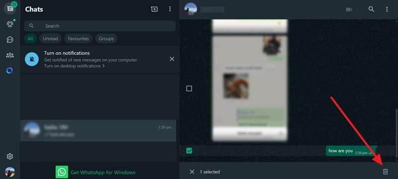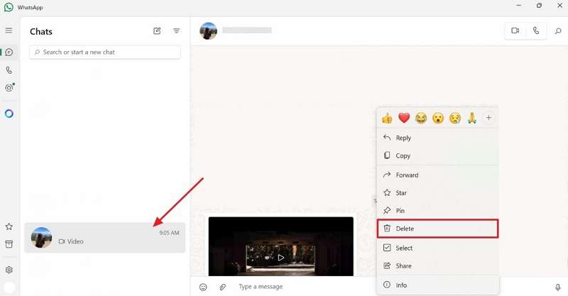 Step 1. To recall a message on Windows, you must first install the desktop version of the app. Afterward, connect your WhatsApp by scanning the QR code via "Link a Device" and wait a few minutes for your chats to load. Access the chat for the specific contact and press the downward arrow to select the "Delete" option from the menu.