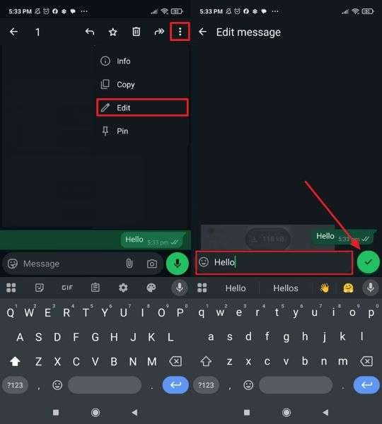 Instructions: On Android, long-press the text and navigate to the “Three-Dots” icon at the top to reveal the drop-down menu. Select the “Edit” option from the list and edit the text in the given text bar. In the end, press the “Tick” button to confirm the alteration.