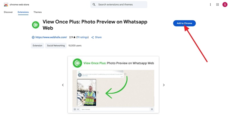 Instructions: Open WhatsApp Web on your device and log in by scanning a QR code on the screen. Once your chats load, access the chat for the person who sent you the one-time photo. Later, search for "View Once Plus: Photo Preview on WhatsApp Web" and click the "Add Chrome" button to embed the extension. Upon receiving a view-once photo, download and preview it as many times as you want.