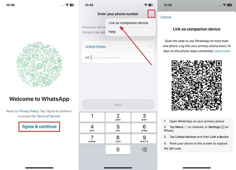 Step 2. After that, reinstall WhatsApp on your phone and open it to choose the "Agree and Continue" button. While on the main screen, expand the "Three Dots" menu to select the "Link as Companion Device" and scan the QR code from your partner's phone to connect both devices.