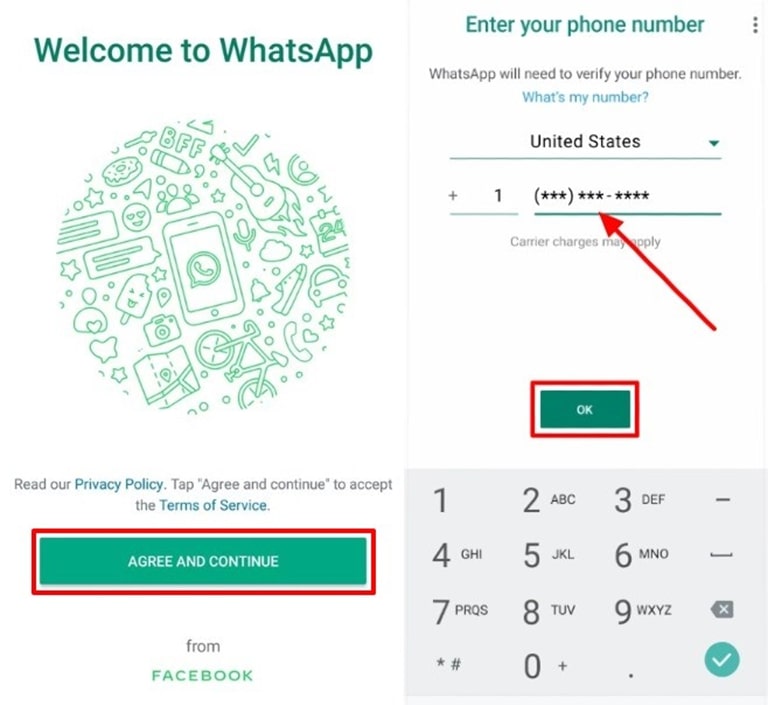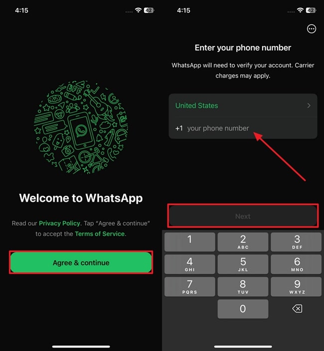 Step 1. For this operating system, install WhatsApp and opt for the “Agree and Continue” button. Then, add the mobile number along with the country code and select the “Next” button to proceed.