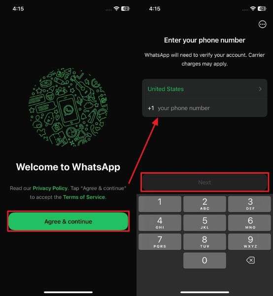 Google Drive BackupStep 1. First, reinstall WhatsApp on your mobile phone and open it. Then, tap the "Agree and Continue" button to select your preferred country. In the designated field, enter the mobile number that you linked with your previous account and press the "OK" button.