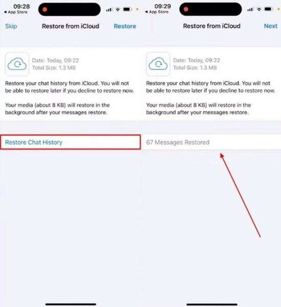 Step 2. After that, a new screen will appear displaying your backup size and the option “Restore Chat History.” Tap on it to restore your data, and WhatsApp will show how many messages and media files have been successfully recovered.