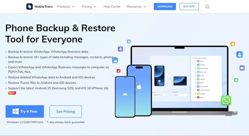 It is a powerful tool that can help users transfer and back up WhatsApp data on over 6,000 devices without restrictions on any operating system. It transfers backup data without deleting existing chats and safely manages old and new messages. The tool provides an option to preview backups before restoration and selectively choose data types, including messages and documents.