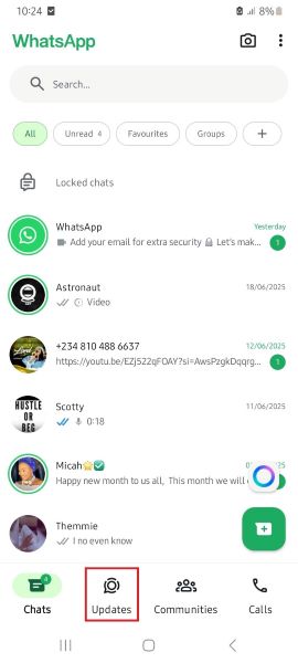 - Open WhatsApp and tap on the Update icon at the bottom of your screen.