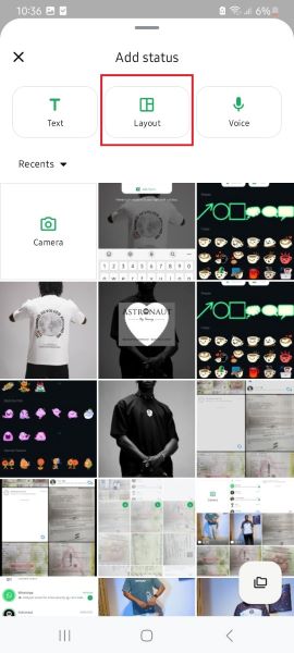 - Tap "Add Status" and select the green Layout icon from the options at the top of your screen.