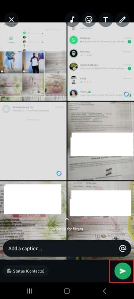 - Tap on Done and swipe up to choose filters if you wish to edit the images. Finally, tap on the green Send icon to share your new status update.