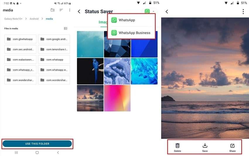 To proceed, open the “File Manager” app on your phone and select the folder where you want to save statuses. Once you choose the desired location, tap “Use This Folder” to confirm. Next, you can tap the WhatsApp icon at the top left corner to switch between WhatsApp and WhatsApp Business as needed. Finally, open the status you want to save and tap “Save” to store it on your device.