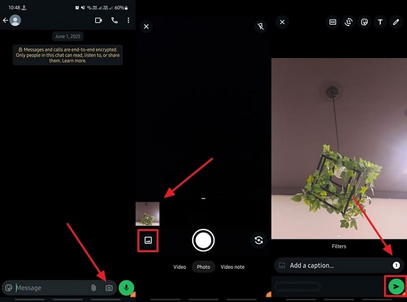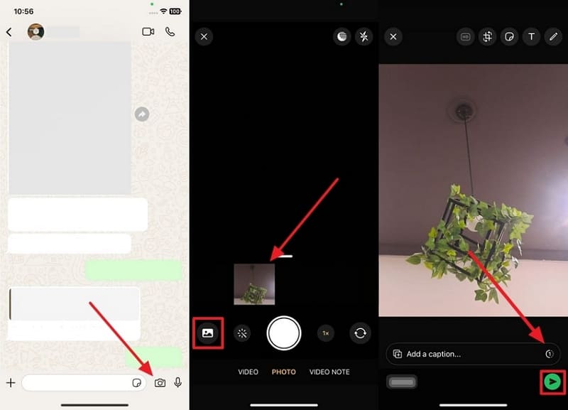Instructions. Select any conversation from the WhatsApp main interface and tap the "Camera" icon in the bottom right corner. Then, take a new photo or choose one from “Photos” to proceed. Following that, select the "1" icon near the caption to enable the view once option, and then click the "Send" button to share it.